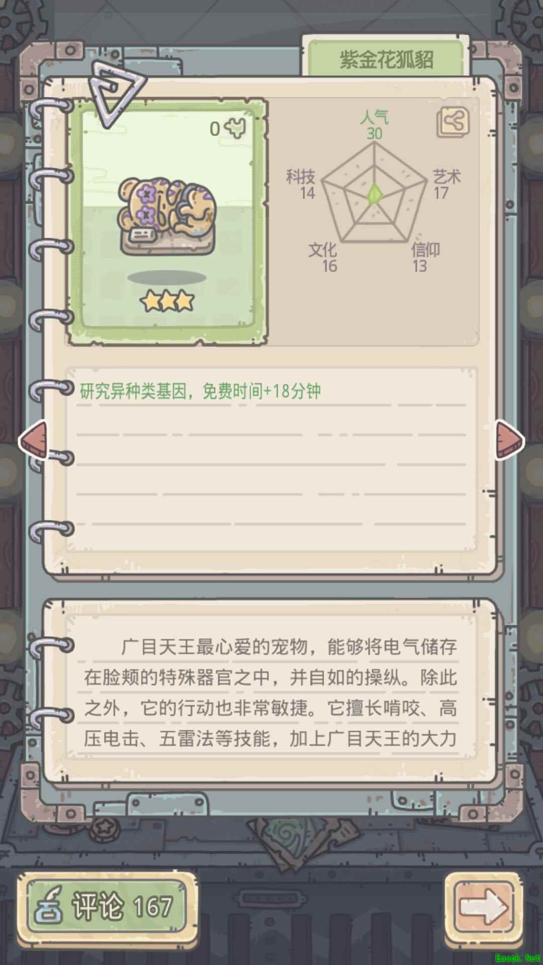 紫金花狐貂属性一览属性介绍 人气30 艺术17 信仰13 文化16 科技14 光环技能:研究异种类基因,免费时间+18分钟 贵重物介绍 名称:紫金花狐貂 品阶:绿色 偏向:人气类贵重品 广目天王最心爱的宠物,能够将电气储存在脸颊的特殊器官之中,并且可以随心所欲的操纵。 此外,它的行动也很敏捷。擅长啃咬、高压电击、五雷法等技能,加上广目天王的大力培养,实力非常强。 获取途径 击败广目天王后获得。