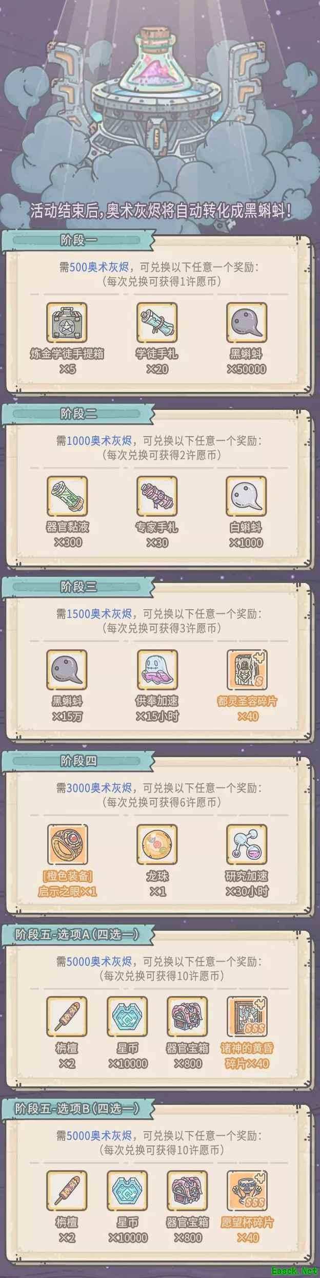 在此活动期间,每次使用八卦炉许愿,即可获得1积分。累积对应的活动积分,可获得上述奖励。 四、灰烬大作战 1、活动期间,可以消耗活动货币【奥术灰烬】,兑换奖励 2、奖励共分为5阶段,每个阶段有2-3种奖励可以兑换 3、需要兑换前一阶的任意一种奖励,才可以兑换后一阶的奖励 4、任意兑换,都会根据奖励阶位,获得额外的许愿币5.活动结束后,玩家身上未消耗的活动货币“奥术灰烬”,会自动转化为黑蝌蚪 【可兑换奖励】