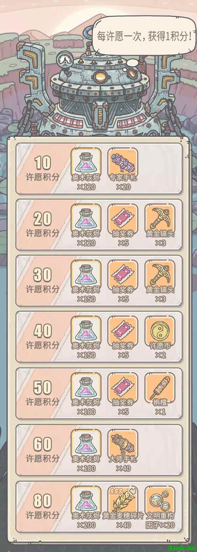 其中的内容是:白蝌蚪×20、许愿币×1、奥术灰烬×100 三、大祈愿之阵