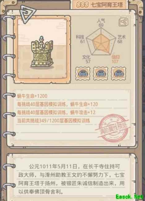 《最强蜗牛》七宝阿育王塔强度介绍一、抽奖推荐 三卡+小礼包玩家,建议投资400抽参与,拿到七宝阿育王塔升级到3星。 运气好能在400抽内拿多一个的话,还可以升级到4星七宝阿育王塔,开启中阶镶嵌技能。 囤货量多的,可以多抽一些,因为根据小道消息,镶嵌技能非常适合11月27日的蜗牛大更新。 中氪玩家可根据抽奖券的数量与个人意愿,冲击七宝阿育王塔直达5星,开启高级镶嵌技能。 二、属性介绍 人气69 艺术68 信仰107 文化57 科技61 蜗牛生命+1200 每挑战40层基因模拟训练,蜗牛生命+120 每挑战40层基因模拟训练,蜗牛攻击+12 当前共挑战0/1200层基因模拟训练