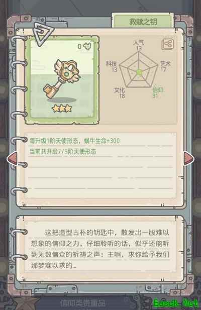 二、贵重物介绍 这把造型古朴的钥匙中,散发出一股难以想象的信仰之力,仔细聆听的话,似乎还能听到无数信众的祈祷之声:主啊,求你给予我们那梦寐以求的… 每升级1阶天使形态,蜗牛生命+300 上限:9阶天使形态