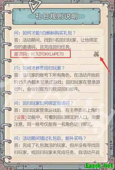 4、在礼包规则中即可查看自己的邀请码,点击标注位置的剪刀即可复制邀请码。