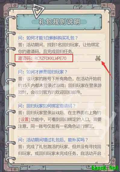 4、在礼包规则中即可查看自己的邀请码,点击标注位置的剪刀即可复制邀请码。