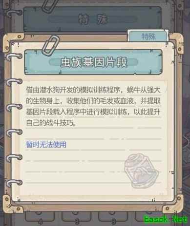 二、用处介绍 借由潜水狗开发的模拟训练程序,蜗牛从强大的生物身上,收集他们的毛发或血液,并提取基因片段载入程序中进行模拟训练,以此提升自己的战斗技巧。 可用于解锁虫族飞龙基因试炼。(暂时无法使用,正式服没有实装)