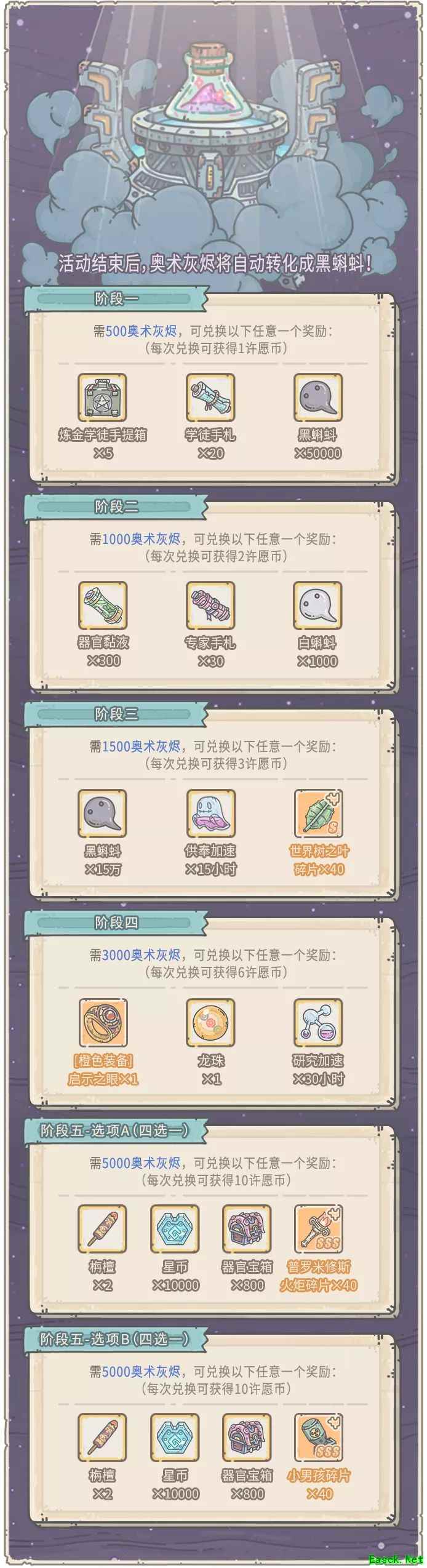 三、灰烬大作战 1、活动期间,可以消耗活动货币“奥术灰烬”,兑换奖励 2、奖励共分为5阶段,每个阶段有2-3种奖励可以兑换 3、需要兑换前一阶的任意一种奖励,才可以兑换后一阶的奖励 4、任意兑换,都会根据奖励阶位,获得额外的许愿币 5、活动结束后,玩家身上未消耗的活动货币“奥术灰烬”,会自动转化为黑蝌蚪 【可兑换奖励】