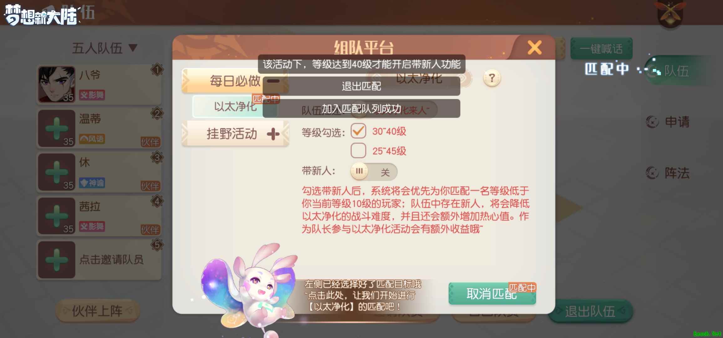 《梦想新大陆》以太净化玩“以太净化”需要组队才能快速完成,不仅可以获得大量经验、银币和物品奖励,而且全天都能做,不用担心会错过。 一、活动简介 1. 以太净化是组队活动,至少3人组队,最好组满五人,战斗的效率更快。 2. 每天仅前50次可获得经验,每10次为一轮,位置不固定,可挂机自动寻路。 3. 队长会享受额外的经验加成,经验随着次数增加,每轮第10次经验最高。 4. “一条龙”的其中一个任务,主要特点是玩法简单,经验奖励丰厚,大多数玩家都是零点之后开始,配合巡查任务,日常副本一起,把当日的组队任务清完,逐步形成了游戏的一种常态。
