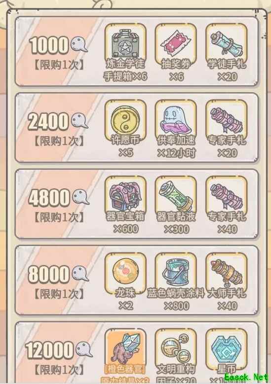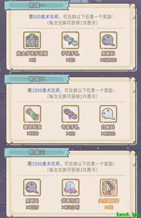 《最强蜗牛》2月5日许愿周玩法攻略一、更新时间 本周五(2月5日)凌晨五点,部分服务器活动将更新为大祈愿之阵。 二、贩售机福利 活动期间,贩售机将出现福利礼包,每天5点刷新,售价1白蝌蚪。 内容为:白蝌蚪×20、许愿币×1、奥术灰烬×100 三、大祈愿之阵 活动期间,每使用八卦炉许愿1次,获得1积分。累积对应的活动积分,可获得以上奖励。 四、灰烬大作战 1.活动期间,可以消耗活动货币“奥术灰烬”,兑换奖励2.奖励共分为5阶段,每个阶段有2-3种奖励可以兑换3.需要兑换前一阶的任意一种奖励,才可以兑换后一阶的奖励4.任意兑换,都会根据奖励阶位,获得额外的许愿币5.活动结束后,玩家身上未消耗的活动货币“奥术灰烬”,会自动转化为黑蝌蚪 【可兑换奖励】