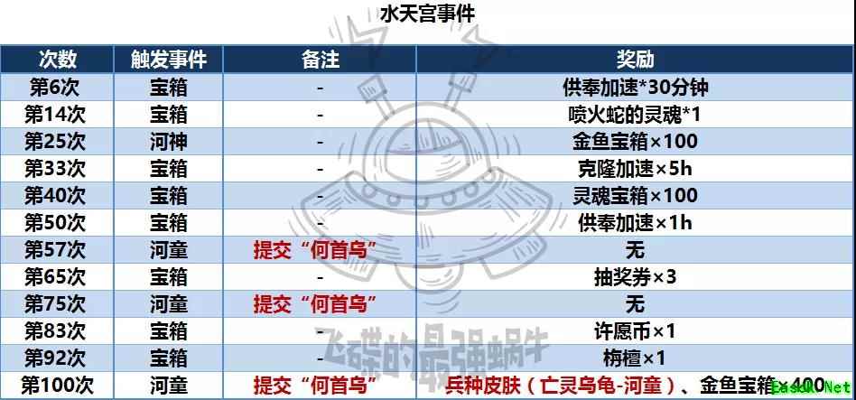 《最强蜗牛》水天宫全事件触发攻略及奖励一览和蜣螂地图的黄金神祭坛事件类似,点燃“水底沉香”,达到一定次数触发事件获得奖励。水天宫位于7号区域,每次物种位置随机出现。 水底沉香通过开启金鱼宝箱概率获得,单次获得5个,上限100个,次数和奖励见图。