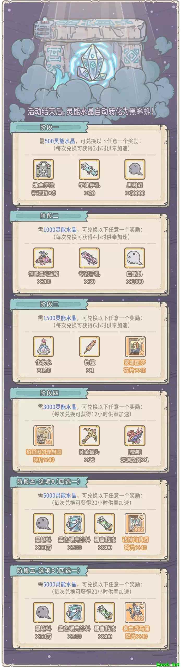 水晶大作战: 1、活动期间,可以消耗活动货币“灵能水晶”兑换奖励 2、奖励共分为5阶段,每个阶段有2-3种奖励可以兑换 3、需要兑换前一阶的任意一种奖励,才可以兑换后一阶的奖励 4、任意兑换,都会根据奖励阶位,获得额外的供奉加速 5、活动结束后,玩家身上未消耗的活动货币“灵能水晶”,会自动转化为黑蝌蚪 可兑换奖励