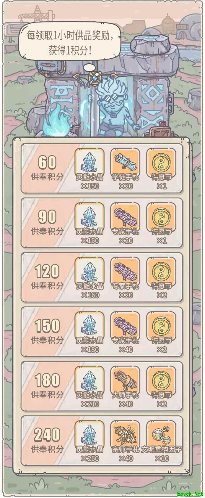 神坛秘仪: 活动期间,每次领取供奉奖励,根据祭品原始的供奉时间,获得活动积分(1小时=1积分)累积对应的活动积分,可获得以下奖励。