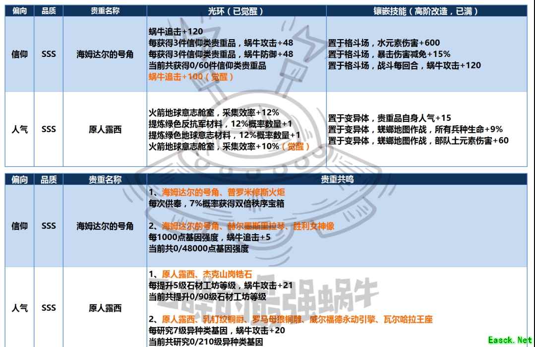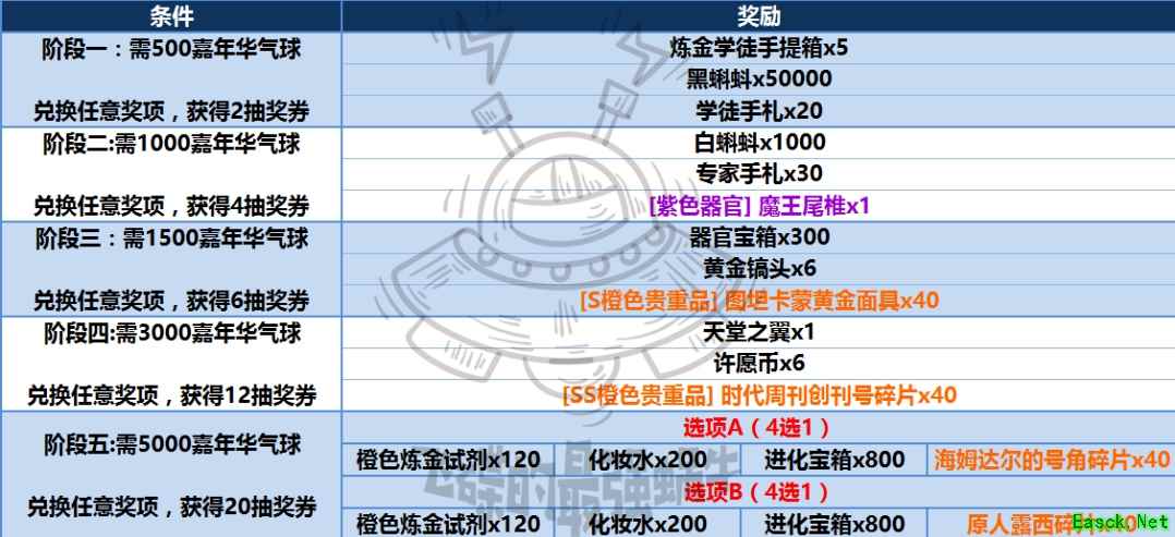 二、兑换建议 1档奖励:学徒手札>黑蝌蚪>炼金学徒手提箱; 碎片在开抽奖机2号后,需求量更大了,如果黑蝌蚪紧缺可以先换黑蝌蚪。 2档奖励:1000白蝌蚪≈器官>专家手札 a. 白蝌蚪和器官可根据自身需要选择,缺白可先换白。 b. 手札看个人情况。 3档奖励:黄金镐头>器官宝箱>图坦卡蒙面具 a. 优先镐头,想赌脸可以换宝箱。 b. 贵重产出途径极其多,直接忽略。 4档奖励:时代周刊创刊号>许愿币>天堂之翼 a. 贵重产出途径不多,没满优先兑换。 b. 有盈余就换许愿币,至于装备,视个人情况。 5档奖励:原人露西>海姆达尔的号角 贵重光环、镶嵌技能和共鸣见表 a. 优先原人露西,效果还过得去,主要还是新贵重,产出途径少。 b. 对新贵重没兴趣,号角没满可以考虑号角。