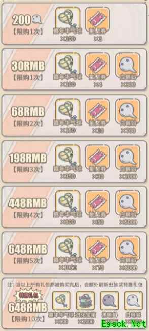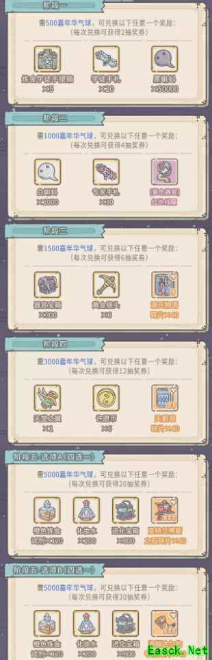 【气球大作战任务】 1、开启1次学徒手札 每次获得30个气球,上限15,合计450气球 2、开启1次专家手札 每次获得75个气球,上限10,合计750气球 3、开启1次大师或宗师手札 每次获得200个气球,上限5,合计1000气球 4、任意途径消耗1500白蝌蚪 每次获得150个气球,上限6000白蝌蚪,合计600气球 活动礼包 【周礼包】
