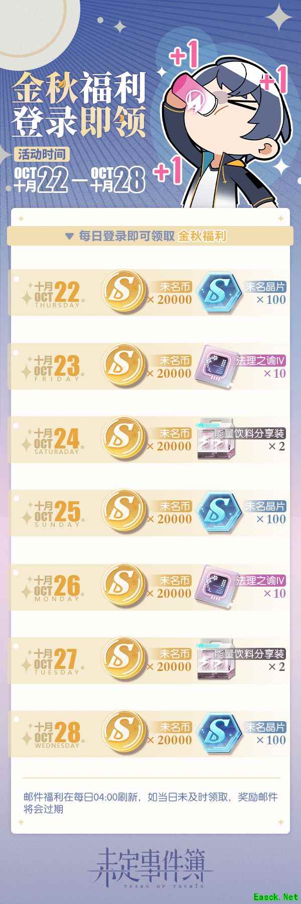 金秋福利内容介绍:每日登录领取福利邮件 活动时间:10月22日04:00至10月29日04:00 奖励内容: 1、活动期间,每日登录游戏即可领取未名币×20000,还可获得未名晶片、法理之谕IV、能量饮料分享装等奖励; 2、初代小贴士:登录福利在每日04:00刷新,如当日未及时领取,奖励邮件将会过期。