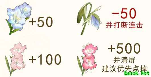 《未定事件簿》缤纷节奏玩法攻略小游戏内容】游戏开始后,界面将会连续显示多束花朵。快速点击得分的花朵,连击数越多,得分越高。 【玩法说明】在有限时间内,点击盛开的花朵得分。连击数达到一定数量获得额外分数,点击枯萎的花朵会扣分并清空连击数;当连击数达到一定数量时,同行的男主会发动支援,生成强力援助花朵。点击援助花朵后将直接清空全部得分花朵并增加相应的分数与连击数。 红色花朵:+500并有清屏功能,优先点 粉色花朵:+100 蓝色花朵:+50 枯萎花朵:-50并打断连击