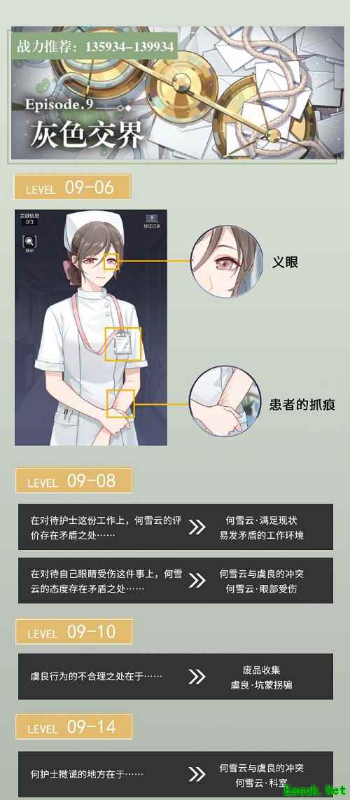 1、第九章推荐通关战力为135934-139934。 2、在对待护士这份工作上,何雪云的评价存在矛盾之处? 3、答:何雪云·满足现状,易发矛盾的工作环境。 4、第九章的答案就按照上面的图参考进行选择就可以了,希望可以帮到大家。 以上就是《未定事件簿》第九章通关攻略的全部内容了,更多手游攻略请关注手游网! 本文内容来源于互联网,如有侵权请联系删除。 |