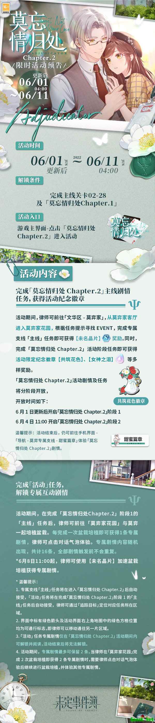 《未定事件簿》莫忘情归处活动介绍【莫忘情归处】 同心结誓言,莫忘情归处。 6月1日更新后,「莫忘情归处Chapter.2」限时活动即将开启! 「莫忘情归处Chapter.2」限时活动预告 活动时间:2022年6月1日更新后-6月11日04:00 一、 完成「莫忘情归处Chapter.2」主线剧情任务,获得活动纪念徽章 活动期间,律师可前往「文华区-莫弈家」,从莫弈家客厅进入莫弈家花园,根据任务提示寻找EVENT,完成专属支线「主线」任务即可获得【未名晶片】奖励。同时,完成「莫忘情归处Chapter.2」活动阶段任务即可获得活动限定纪念徽章【共筑花色】、【女神之泪】等多样奖励 「莫忘情归处Chapter.2」活动剧情及任务将分阶段开放,开放时间如下: -6月1日更新后开启「莫忘情归处Chapter.2」阶段1 -6月4日11:00开启「莫忘情归处Chapter.2」阶段 2 ※活动结束后,仍可前往手机界面-「导航-莫弈专属支线-甜蜜篇章」体验「莫忘情归处Chapter.2」剧情