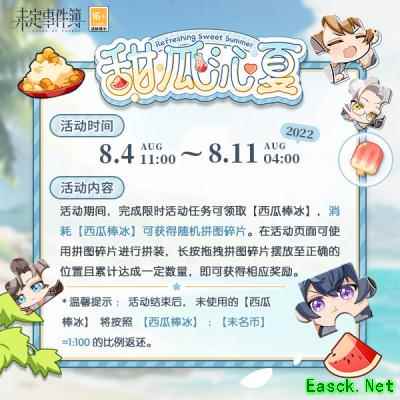 《未定事件簿》甜瓜沁夏活动玩法攻略活动时间 2022年8月4日 11:00 -2022年8月11日 03:59 活动内容 玩家需要在活动期间完成限时活动任务,可领取【西瓜棒冰】,消耗【西瓜棒冰】可获得随机拼图碎片; 玩家使用随机拼图碎片进行拼图,拼图成功之后可以获得获得相应奖励。
