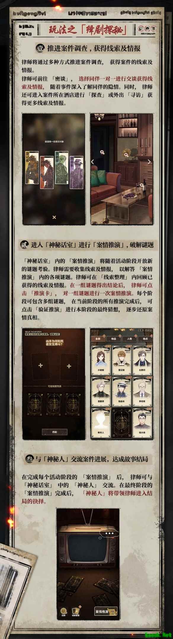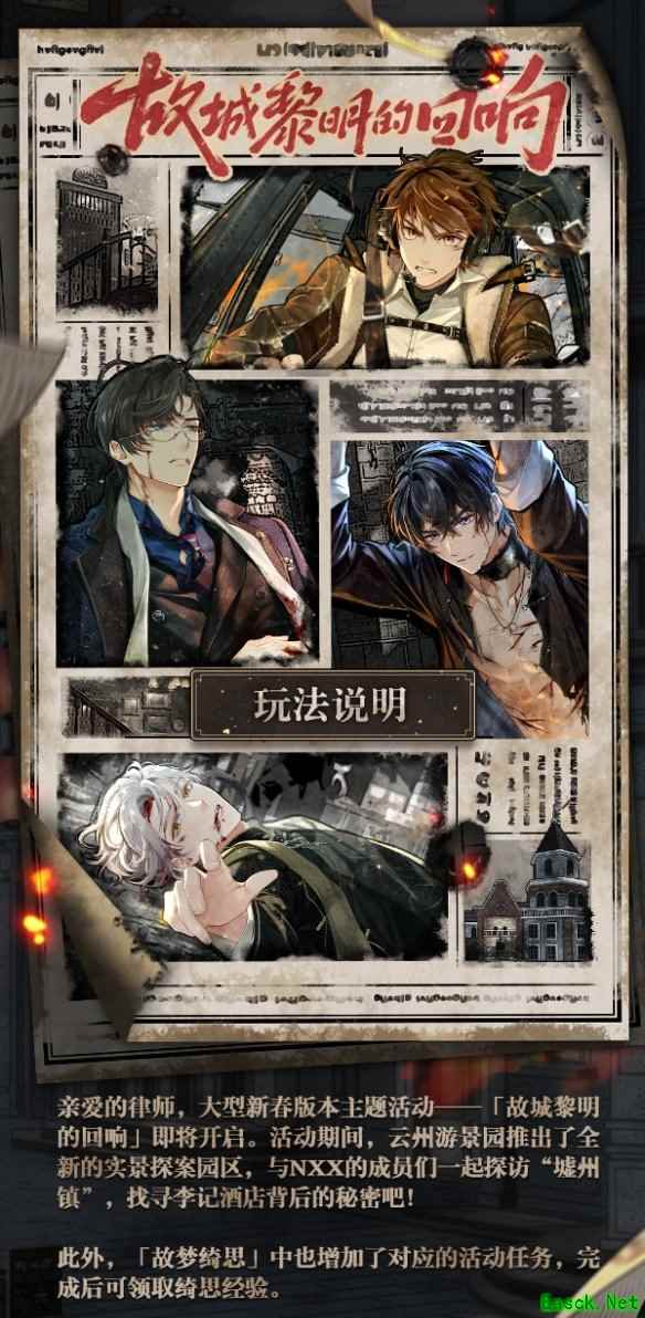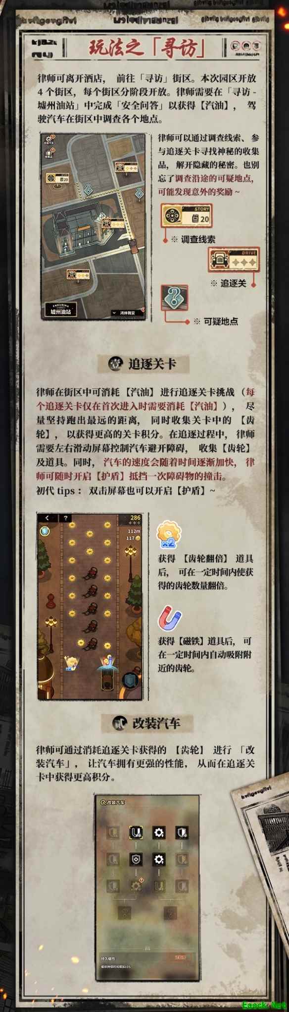 《未定事件簿》故城黎明的回响活动玩法一览【玩法说明】 参与实景探案,探访墟州旧事。 1月12日更新后-1月30日04:00,大型新春版本主题活动「故城黎明的回响」正式开启!主要活动玩法如下: 一、绎剧探秘 律师将通过多种方式推进案件调查,获得案件的线索及情报,并进入「神秘话室」进行「案情推演」,破解谜题。完成每个活动阶段的「案情推演」后,可与「神秘人」交流案件进展,达成故事结局。 二、寻访 律师可离开酒店,前往「寻访」街区。在「寻访-墟州油站」中完成「安全问答」以获得【汽油】,驾驶汽车在街区中调查各个地点。律师可以通过调查线索、参与追逐关卡寻找神秘的收集品,解开隐藏的秘密。也别忘了调查沿途的可疑地点,可能发现意外的奖励。