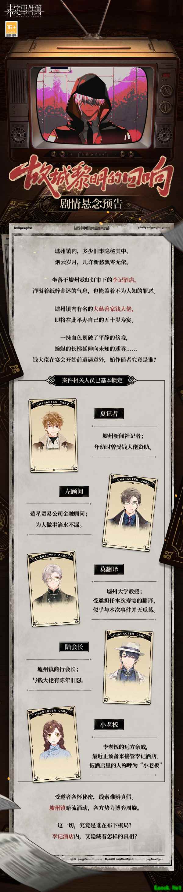 《未定事件簿》故城黎明的回响活动介绍:墟州镇内,多少旧事隐秘其中, 烟云岁月,几许新愁飘零无依。 坐落于墟州霓虹灯市下的李记酒店, 洋溢着纸醉金迷的气息,也掩盖着不为人知的罪恶。 墟州镇内有名的大慈善家钱大佬,即将在此举办自己的五十岁寿宴。 一抹血色划破了平静的傍晚,蜿蜒的长梯延伸向未知的迷雾…… 钱大佬在宴会开始前遭遇意外,始作俑者究竟是谁? 1月12日,大型新春版本主题活动「故城黎明的回响」即将开启,全新剧本演绎玩法上线,敬请期待!