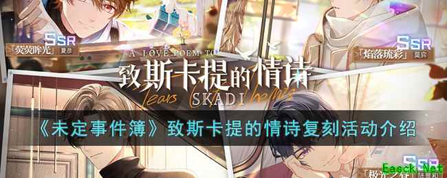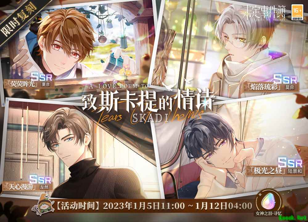 《未定事件簿》致斯卡提的情诗复刻活动介绍:一、「致斯卡提的情诗」活动女神之影限时复刻 1、活动时间:2023年1月5日11:00-1月12日04:00 2、活动内容: 活动期间,律师可在「致斯卡提的情诗·夏彦」、「致斯卡提的情诗·左然」、「致斯卡提的情诗·莫弈」及「致斯卡提的情诗·陆景和」四个活动女神之影界面使用【女神之泪·寻忆】进行启示。其中「致斯卡提的情诗」活动限定SSR思绪:夏彦SSR【荧荧眸光】、左然SSR【天心漫游】、莫弈SSR【焰落琉彩】、陆景和SSR【极光之昼】获得概率提升。每100次启示内必得活动限定SSR,且每次启示可获得【泪之痕·寻忆】×1。 ※【女神之泪·寻忆】为4SSR活动女神之影第二次复刻起使用的通用女神之泪。 每个活动女神之影中的SSR思绪仅包含对应男主的4张SSR: -「致斯卡提的情诗·夏彦」包含:活动限定SSR【荧荧眸光】、「异乡行歌」活动SSR【此心安处】、SSR【最佳拍档】、SSR【微醺视线】。