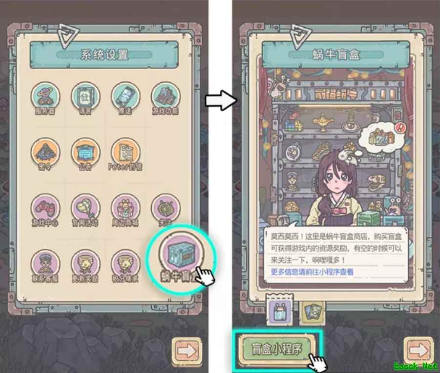 《最强蜗牛》蜗牛盲盒活动介绍首批限量50000盒,1月14日11时限时开售,售完即止! 正式服的蜗爷们,可以在游戏内的系统设置中通过『蜗牛盲盒』界面,点击『盲盒小程序』进入!