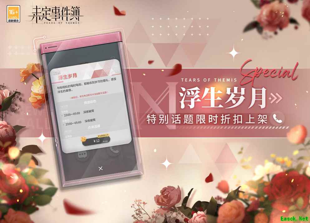 《未定事件簿》新增通话话题浮生岁月介绍【新增通话话题】 相伴点滴日常,共叙浮生岁月。 2022年12月22日,特别通话话题<浮生岁月>上架商城! 1、特别通话话题<浮生岁月>限时折扣 -活动时间:2022年12月22日11:00-2023年1月5日4:00 -活动期间, 4位男主特别通话话题<浮生岁月>将限时折扣上架,每位男主的通话话题解锁价格为12元,共计6段语音通话内容。 -特别通话话题开放购买后,已拥有对应男主行程表解锁电话拨打功能的律师可前往「主界面手机-联系-对应男主个人资料」界面,查看新增话题详情,并购买解锁话题。解锁特别通话话题后,在话题对应时间段,可在拨打电话界面选择「额外话题」中的内容进行通话。 2、初代小贴士: -每次拨打电话存在10分钟的冷却时间,四位男主单独计算时间间隔,需要在冷却时间结束后才能进行后续拨打。 -活动结束后,特别通话话题<浮生岁月>将恢复原价18元。