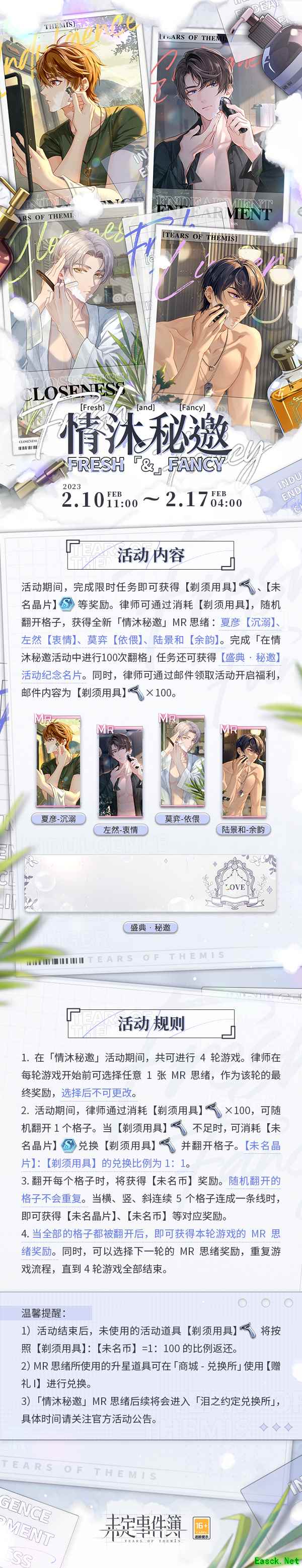 《未定事件簿》情沐秘邀活动玩法介绍:【情沐秘邀】 光影交织,情思缠绕。浪漫起笔,心动相邀。 一、「情沐秘邀」活动限时开放 1、活动时间:2023年2月10日11:00-2月17日04:00 2、活动内容:活动期间,完成限时任务即可获得【剃须用具】、【未名晶片】等奖励。 律师可通过消耗【剃须用具】,随机翻开格子,获得全新「情沐秘邀」MR思绪:夏彦【沉溺】、左然【衷情】、莫弈【依偎】、陆景和【余韵】。 完成「在情沐秘邀活动中进行100次翻格」任务还可获得【盛典·秘邀】活动纪念名片。 同时,律师可通过邮件领取活动开启福利,邮件内容为【剃须用具】×100。 二、小贴士 1、活动结束后,未使用的活动道具【剃须用具】将按照【剃须用具】:【未名币】=1:100的比例返还。 2、MR思绪所使用的升星道具可在「商城-兑换所」使用【赠礼 I】进行兑换。 3、「情沐秘邀」MR思绪后续将会进入「泪之约定兑换所」,具体时间请关注官方活动公告。