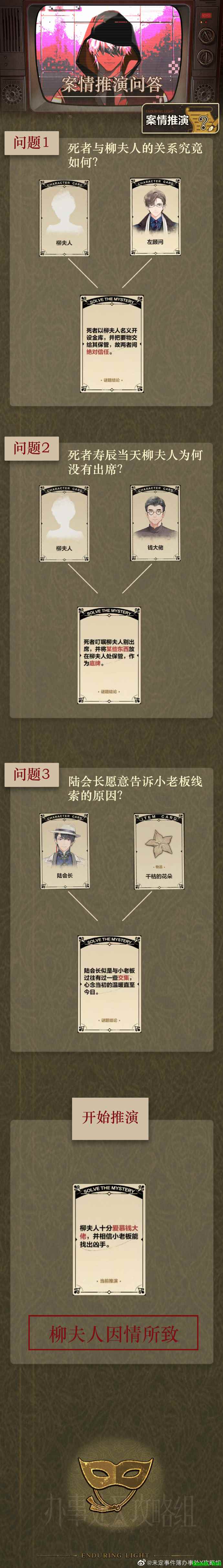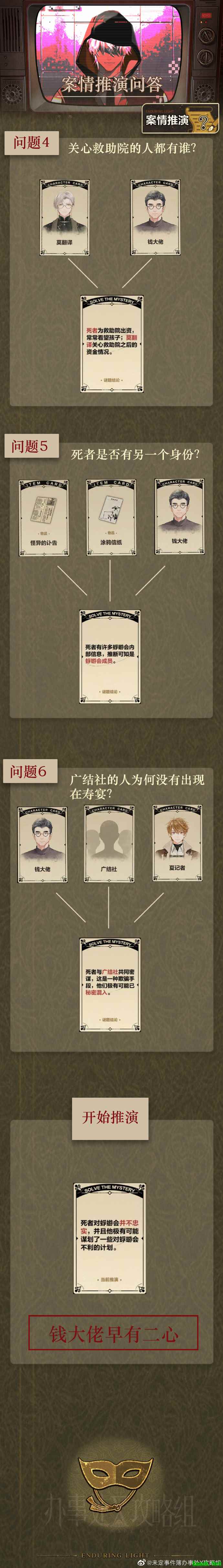 《未定事件簿》案情推演第二阶段答案分享:1、莫翻译+钱大佬 2、钱大佬+怪异的讣告+涂鸦信纸 3、广结社+夏记者+钱大佬 4、最终结论:钱大佬早有二心