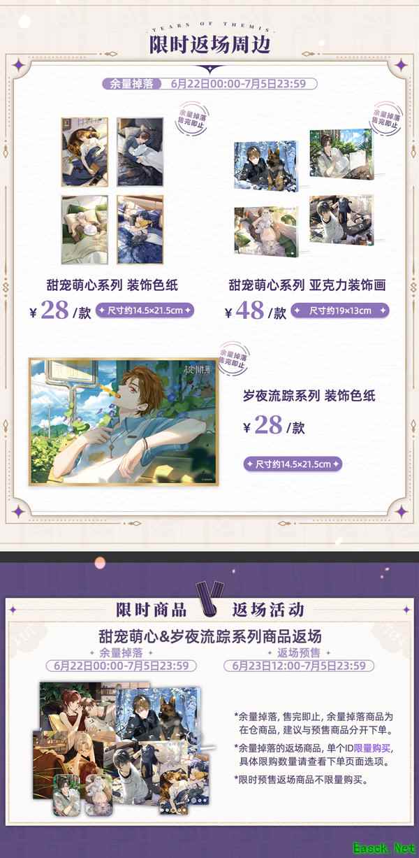 《未定事件簿》限时周边返场内容汇总购买位置: 「miHoYo天猫旗舰店」、「米游社-未名商城」返场 活动时间: 2023年6月22日00:00-7月5日23:59 人气周边余量掉落 -「甜宠萌心」系列 方形徽章、PP海报、亚克力挂件、装饰色纸、亚克力装饰画 风和日暖恋心萌动