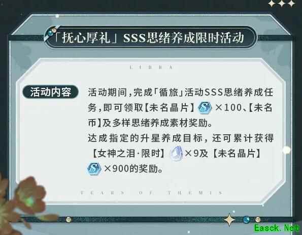 抚心厚礼SSS思绪养成限时活动 活动时间:2024年2月20日11:00-2月27日04:00 活动期间,完成「循旅」活动SSS思绪养成任务,即可领取【未名晶片】×100、【未名币】及多样思绪养成素材奖励。达成指定的升星养成目标,还可累计获得【女神之泪·限时】×9及【未名晶片】×900的奖励