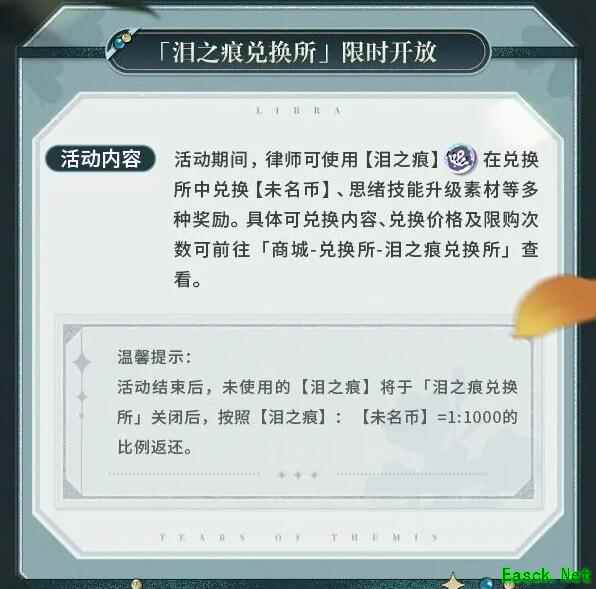 泪之痕兑换所限时开放 活动时间:2024年2月20日11:00-2月27日04:00 活动期间,律师可使用【泪之痕】在兑换所中兑换【未名币】、思绪技能升级素材等多种奖励。具体可兑换内容、兑换价格及限购次数可前往「商城-兑换所-泪之痕兑换所」查看 ※活动结束后,未使用的【泪之痕】将于「泪之痕兑换所」关闭后,按照【泪之痕】:【未名币】=1:1000的比例返还