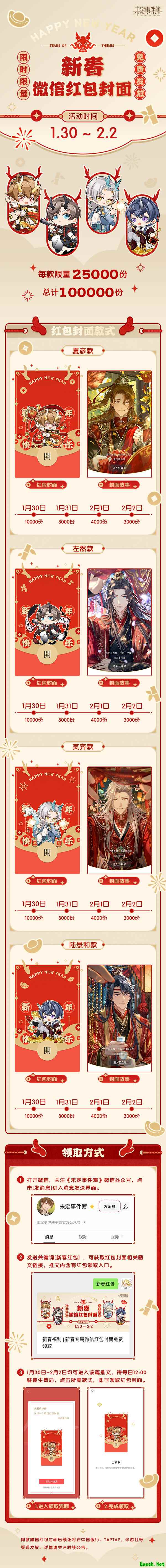-2月8日-2月20日,前往TapTap搜索「红包封面」,参与TapTap新春活动,完成任务即可兑换,总计30,000份。活动详情请关注@TapTap发现好游戏 后续公告
