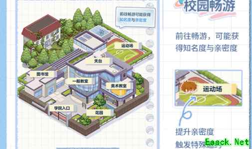 2、校园畅游:前往畅游,可能获得知名度与亲密度,在运动场提升亲密度触发特殊邀约。