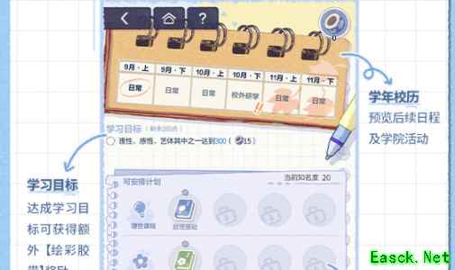 3、计划安排:选择学习伙伴,自由安排各类课程,完成阶段学习,提高学习能力值与知名度。