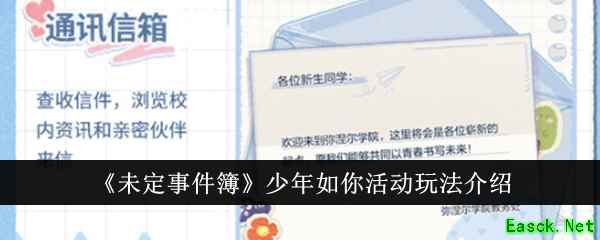 《未定事件簿》少年如你活动玩法介绍活动时间 2024年4月28日更新后-5月16日04:00 活动介绍 活动期间,可自主规划各类课程学习,参与丰富多彩的学院活动,提高学习能力值与校园知名度。能力值将影响同学在学力测试、校外研学等学院活动中的得分;知名度将在学院义卖、学院庆典中发挥作用。学习旅程中,选择学习伙伴共同畅游校园、学习课程、参加学院活动,还可提升亲密度,解锁专属校园剧情。 活动说明 1、通讯信箱:查收信件,浏览校内资讯和亲密伙伴来信。