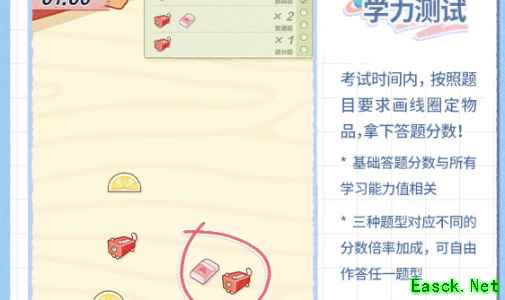 5、学力测试:“考试时间内,按照题目要求画线圈定物品,拿下答题分数!*基础答题分数与所有学习能力值相关。 注:三种题型对应不同的分数倍率加成,可自由作答任一题型。