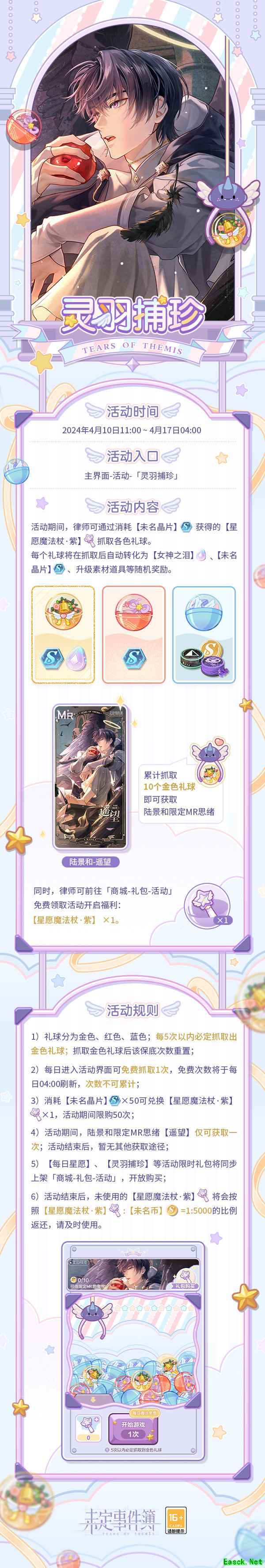 《未定事件簿》灵羽捕珍活动内容一览抓取各色礼球,获得丰富奖励。 2024年4月10日11:00,「灵羽捕珍」限时活动开启! 「灵羽捕珍」限时活动开放 ▶活动时间:2024年4月10日11:00-4月17日04:00 活动期间,律师可通过消耗【未名晶片】获得的【星愿魔法杖·紫】抓取各色礼球。每个礼球将在抓取后自动转化为【女神之泪】、【未名晶片】、升级素材道具等随机奖励;累计抓取10个金色礼球即可获取陆景和限定MR思绪【遥望】 ※活动期间,律师可前往「商城-礼包-活动」免费领取活动开启福利:【星愿魔法杖·紫】×1