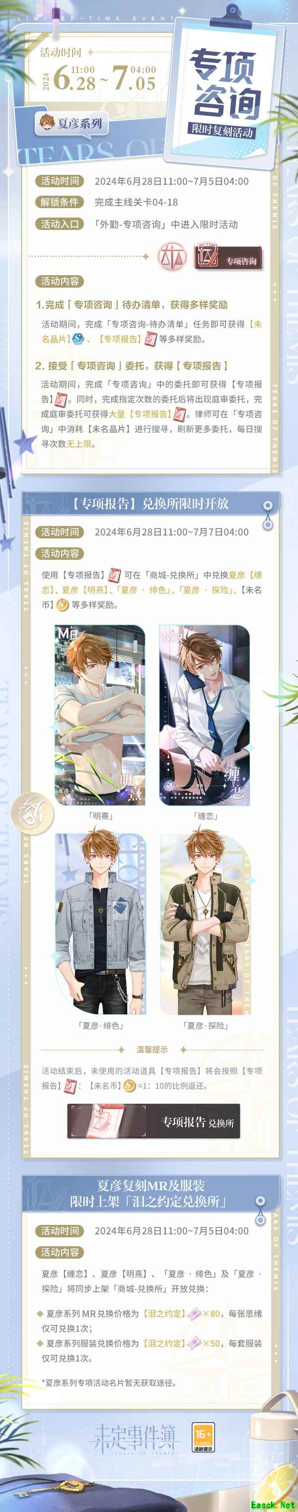 【专项报告】兑换所限时开放 ▶活动时间:2024年6月28日11:00-7月7日04:00 使用【专项报告】可在「商城-兑换所」中兑换夏彦【缠恋】、夏彦【明熹】、「夏彦 · 绯色」、「夏彦 · 探险」、【未名币】等多样奖励 ※活动结束后,未使用的活动道具【专项报告】将会按照【专项报告】:【未名币】=1:10的比例返还 夏彦复刻MR及服装限时上架「泪之约定兑换所」 ▶活动时间:2024年6月28日11:00-7月5日04:00 夏彦【缠恋】、夏彦【明熹】、「夏彦 · 绯色」及「夏彦 · 探险」将同步上架「商城-兑换所」开放兑换: -夏彦系列MR兑换价格为【泪之约定】×80,每张思绪仅可兑换1次; -夏彦系列服装兑换价格为【泪之约定】×50,每套服装仅可兑换1次。 ※夏彦系列专项活动名片暂无获取途径 以上就是小编整理带来的未定事件簿专项咨询活动玩法介绍,更多相关游戏攻略,请关注手游网! 本文内容来源于互联网,如有侵权请联系删除。 |