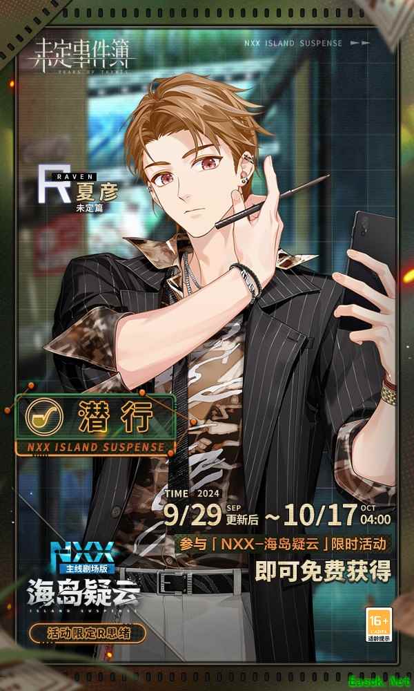 《未定事件簿》海岛疑云活动奖励一览一、上线时间 9月29日版本更新后,全新主线剧场版活动「NXX-海岛疑云」正式上线! 二、活动介绍 活动精彩纷呈 福利惊喜派送 -完成「NXX-海岛疑云」活动限时任务,可累计获得【女神之泪·限时】×11;完成活动限时签到,可累计获得【女神之泪·限时】×10 -完成第一阶段对应任务,可获得夏彦R思绪【潜行】、左然R思绪【猎逐】、莫弈R思绪【洞察】、陆景和R思绪【放怀】;完成所有男主结局,可获得活动名片【盛典 · 疑云】 -完成所有线索墙复盘,可获得活动限定徽章【NXX-谍海】 -揭晓事件真相,可获得活动限定邀请函【新吉加行动】 ※更多福利内容及活动详情请关注后续公告