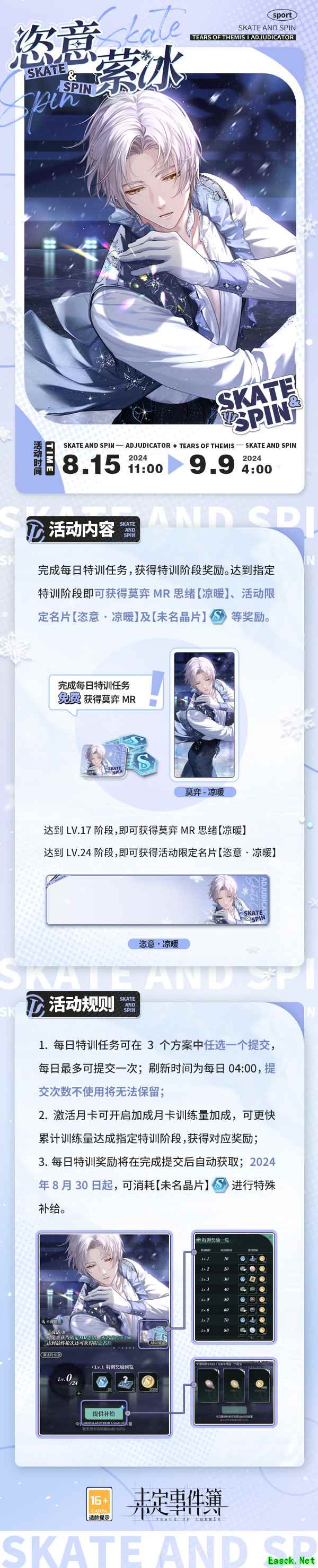 《未定事件簿》恣意萦冰活动玩法介绍【恣意萦冰】 完成特训任务,获取丰富奖励。 「恣意萦冰」限时活动开放 ▶活动时间:2024年8月15日11:00-9月9日04:00 活动期间,律师可通过选择不同的「提供补给」方案完成每日特训任务,获得特训阶段奖励。达到指定特训阶段即可获得莫弈MR思绪【凉暖】、活动限定名片【恣意 · 凉暖】及【未名晶片】等奖励