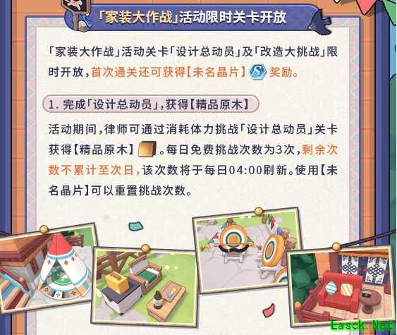 三、家装大作战 1、活动时间:2024年8月5日11:00-8月15日04:00 2、家装大作战」活动关卡:「设计总动员」及「改造大挑战」限时开放。