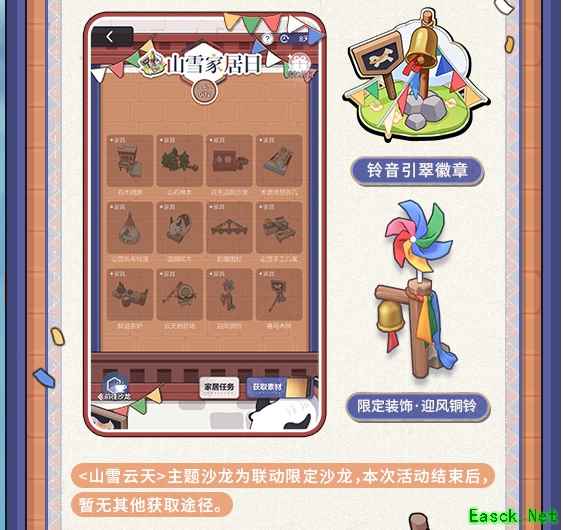 二、家居任务 1、活动时间:2024年8月5日11:00-8月15日04:00 2、玩法介绍:活动期间,玩家只需完成「家居任务」就能获得<山雪云天>主题家具【图纸】、【精品原木】、【未名晶片】等奖励。 2、并且完成[定制11件<山雪云天>主题家具]的限时任务后,还能额外可获得活动限定徽章【铃音引翠】。 3、完成「家居任务-进阶创意」中全部任务就能领取限定装饰【迎风铜铃】。