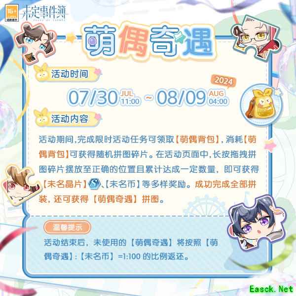 《未定事件簿》萌偶奇遇活动玩法介绍【萌偶奇遇】 仲夏流光如画,相伴畅享乐园。 2024年7月30日,活动拼图「萌偶奇遇」限时开放! 解锁拼图 获得多样奖励 活动时间:2024年7月30日11:00-8月9日04:00 活动期间,完成限时活动任务可领取【萌偶背包】。消耗【萌偶背包】可获得随机拼图碎片。在活动页面中,长按拖拽拼图碎片摆放至正确的位置且累计达成一定数量,即可获得【未名晶片】、【未名币】等奖励!成功完成全部拼装,还可获得【萌偶奇遇】拼图 ※初代小贴士:活动结束后,未使用的【萌偶背包】将按照【萌偶背包】:【未名币】=1:100的比例返还