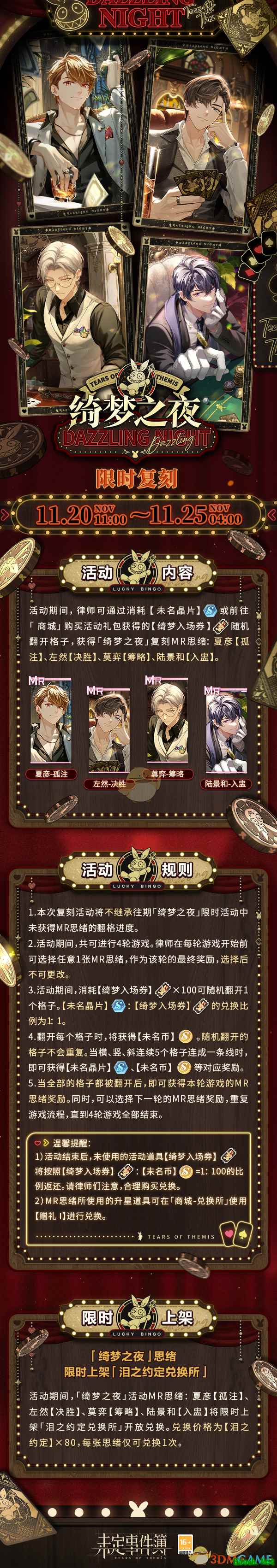 《未定事件簿》绮梦之夜活动MR思绪限时复刻介绍夜色灯影交织,今宵鎏金一梦。 2024年11月20日11:00,「绮梦之夜」活动限时复刻! 「绮梦之夜」活动限时复刻 ▶活动时间:2024年11月20日11:00-11月25日04:00 活动期间,律师可通过消耗【未名晶片】或前往「商城」购买活动礼包获得的【绮梦入场券】随机翻开格子,获得「绮梦之夜」复刻MR思绪:夏彦【孤注】、左然【决胜】、莫弈【筹略】、陆景和【入盅】 ※初代小贴士 -活动结束后,未使用的活动道具【绮梦入场券】将按照【绮梦入场券】:【未名币】=1:100的比例返还。请律师们注意,合理购买兑换 -MR思绪所使用的升星道具可在「商城-兑换所」使用【赠礼 I】进行兑换 ✨「绮梦之夜」思绪限时上架「泪之约定兑换所」 ▶活动时间:2024年11月20日11:00-11月25日04:00 活动期间,「绮梦之夜」活动MR思绪:夏彦【孤注】、左然【决胜】、莫弈【筹略】、陆景和【入盅】将限时上架「泪之约定兑换所」开放兑换。兑换价格为【泪之约定】×80,每张思绪仅可兑换1次 ※活动详情请点击下方长图查看↓↓↓