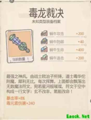 最强蜗牛装备合成优先级是什么一、优先合成 1、毒龙裁决:提升暴击率和毒元素伤害,氪金获取。