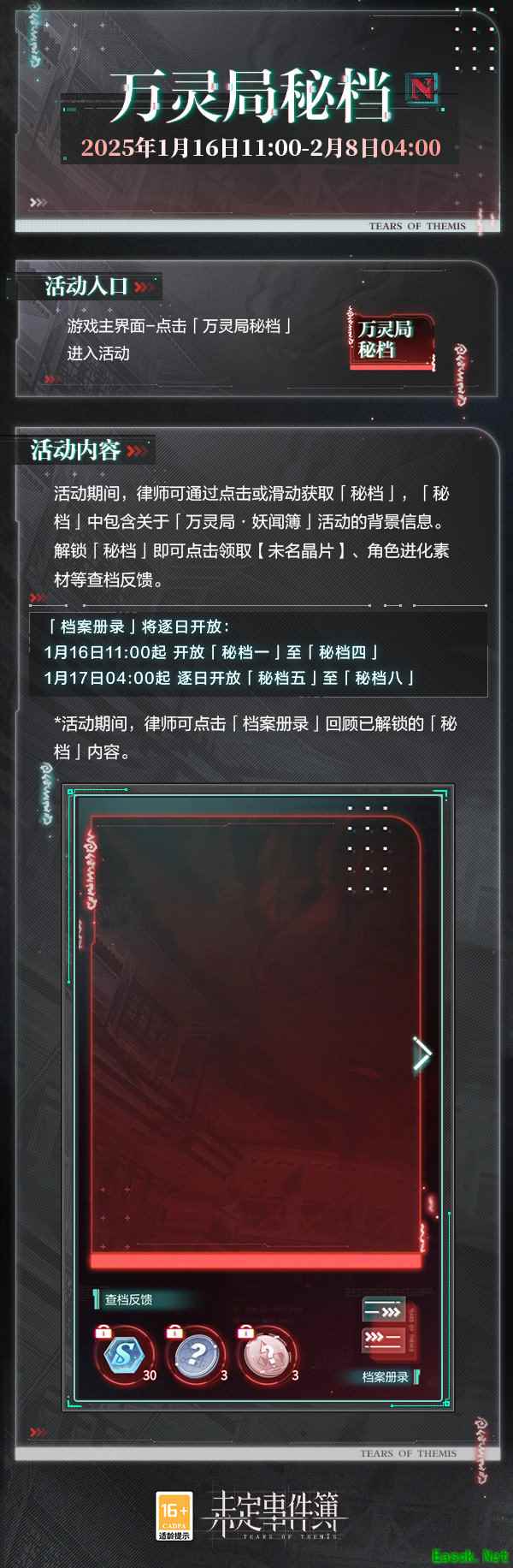 未定事件簿万灵局秘档怎么玩?【万灵局秘档】 探得合虚秘闻,直面人妖境界。 2025年1月16日,限时活动「万灵局秘档」即将开放! 「万灵局秘档」限时活动预告 ▶活动时间:2025年1月16日11:00-2月8日04:00 活动期间,律师可通过点击或滑动获取「秘档」,「秘档」中包含关于「万灵局·妖闻簿」活动的背景信息。解锁「秘档」即可点击领取【未名晶片】、角色进化素材等查档反馈 ※活动详情请点击下图↓↓↓