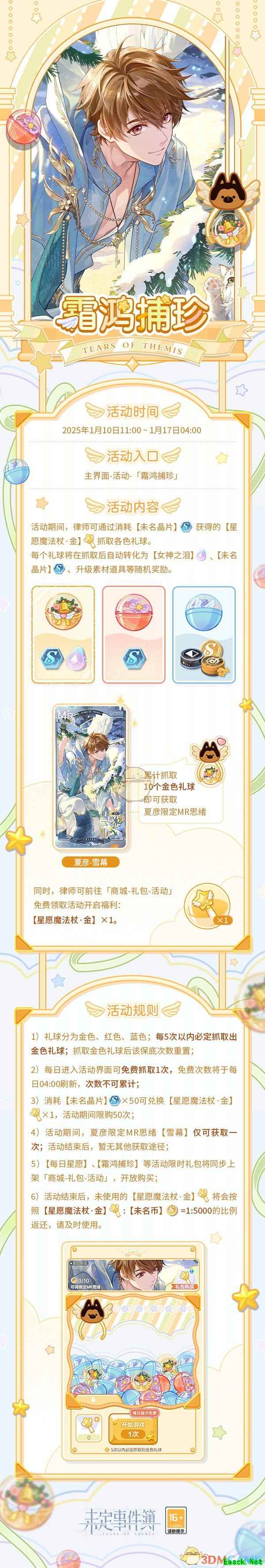 未定事件簿霜鸿捕珍怎么玩?【霜鸿捕珍】 抓取各色礼球,获取丰富奖励。 2025年1月10日11:00,「霜鸿捕珍」限时活动开启! 「霜鸿捕珍」限时活动开放 ▶活动时间:2025年1月10日11:00-1月17日04:00 活动期间,律师可通过消耗【未名晶片】获得的【星愿魔法杖·金】抓取各色礼球。每个礼球将在抓取后自动转化为【女神之泪】、【未名晶片】、升级素材道具等随机奖励;累计抓取10个金色礼球即可获取夏彦限定MR思绪【雪幕】 ※活动期间,律师可前往「商城-礼包-活动」免费领取活动开启福利:【星愿魔法杖·金】×1