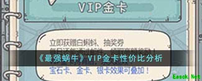 《最强蜗牛》VIP金卡性价比分析VIP金卡性价比分析: VIP金卡是非常值得购买的。 VIP金卡是永久有效的,小编推荐玩家们可以在游玩3-5天之后再考虑要不要购买这个金卡。 购买金卡的玩家每天都能获得150白蝌蚪、大师手札、1小时供奉加速时间,还能直接获得1000白蝌蚪和8个抽奖券。 但是只推荐打算长期游玩的玩家,如果是短期上号体验一下游戏的玩家不推荐购买