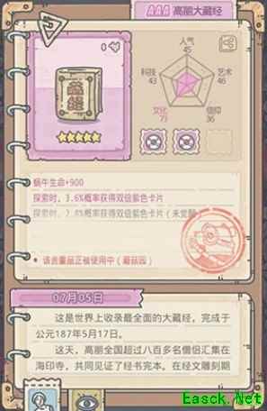 《最强蜗牛》巴黎地下墓穴攻略地缝66层巴黎地下墓穴展示物品介绍: 1、高丽大藏经 玩家们可以通过抽奖、开启高丽藏宝图来获得高丽大藏经。