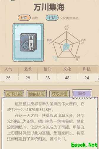 二、万川集海 1、镶嵌技能: 置于扶桑博物馆, 赋予效果: 扶桑探索,蜗牛攻击+20 2、获取途径 开启扶桑藏宝图获得